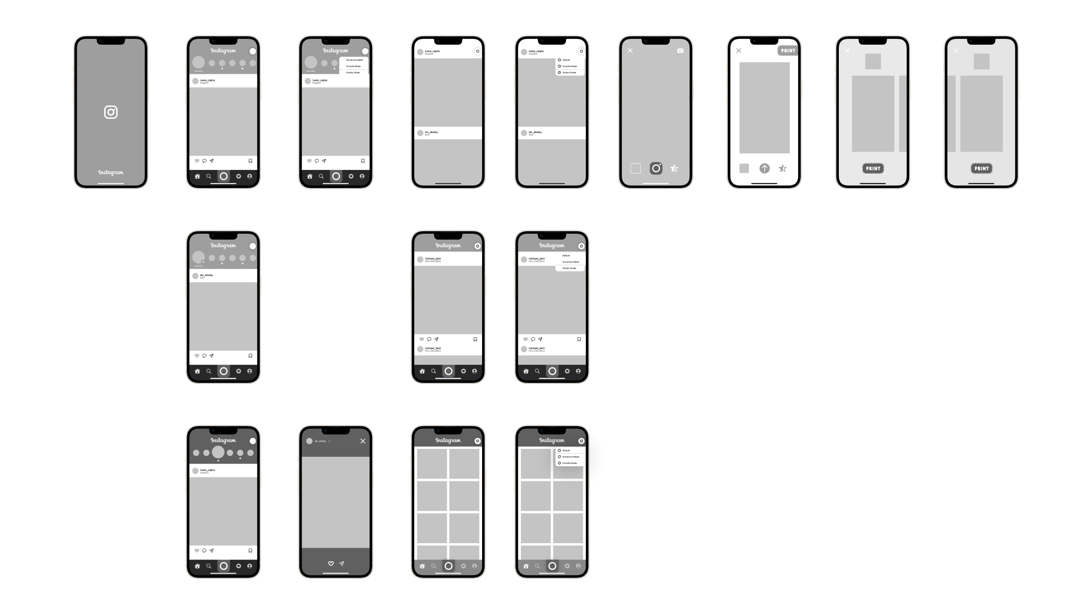 Re-think the idea of redesigning an interface that brings back great memories of the Instagram app and utilizing a new design language to give people an easy-to-use and natural way to use the app with users' original habits. I discovered to keep the app in a unique language, and remove copied features or adjust the features to make it distinctive. It may bring engagement to the Instagram app, and reduce the number of users who do not want to use the app anymore. An early brainstorming means I did not make a decision on what kind of project I am going to make. The take feedbacks were about the overall ideas. It could give me ideas that can help me to do further research on the project. For example, what types of themes I am going to work on. If I made a certain theme, what kinds of material do I need to collect and research?