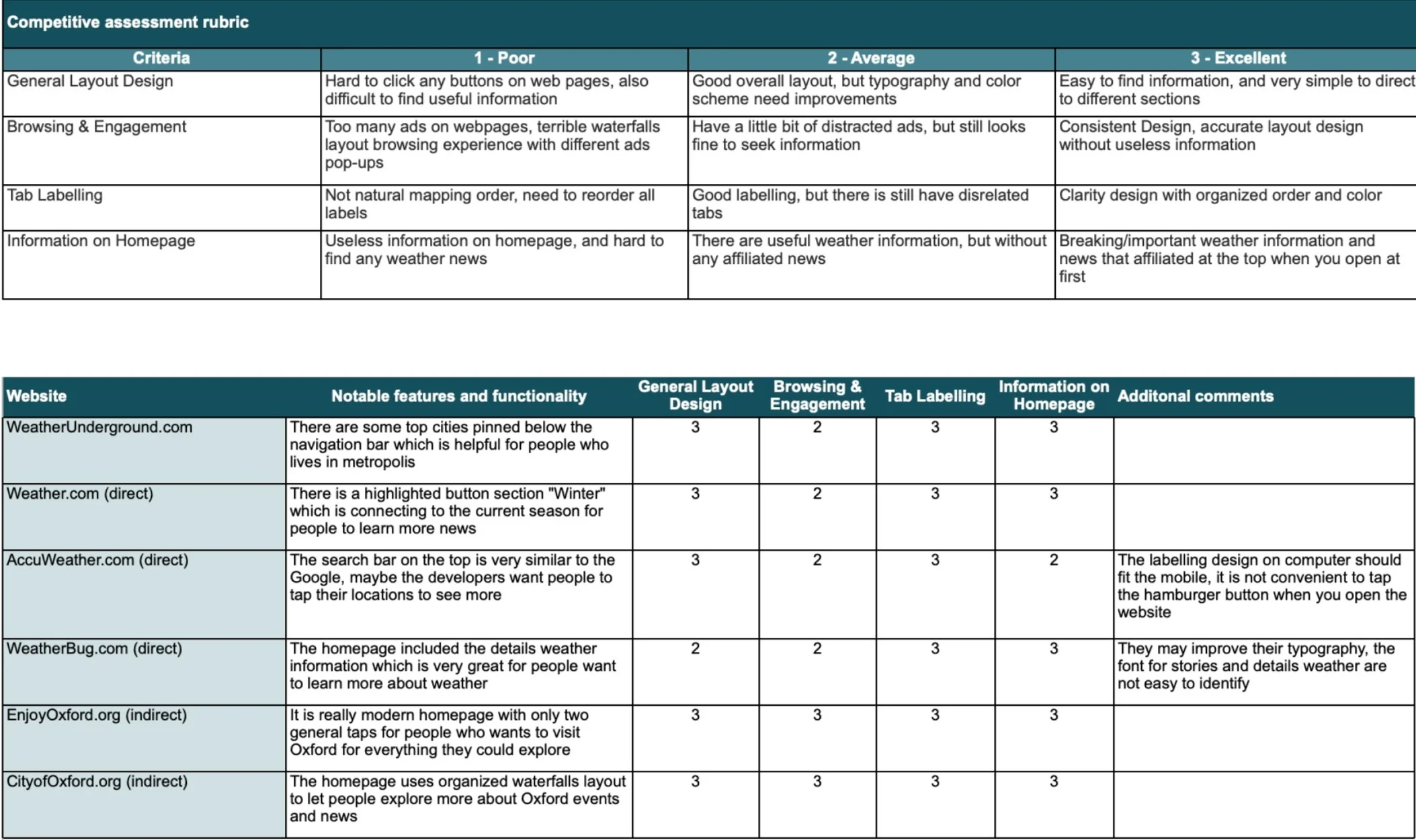 Our research is partly focusing on comparing multiple weather information competitors including direct and indirect websites. We generally created a competitive assessment rubric for scoring the competitors’ websites and highlighting their strengths and weaknesses to conduct what kinds of information we may need to present to customers on desktops. We randomly picked three users who often use weather-related tools to perform interviews through Zoom calls. The questions we generated are based on the comparative analysis and we take notes while they are answering.