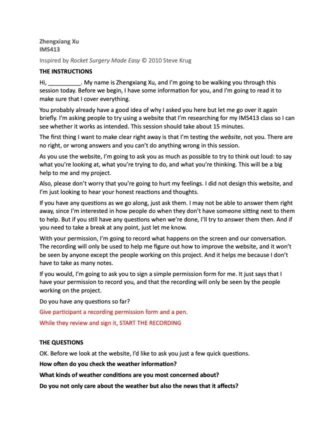 All types of questions we created are connected to the common tasks on weather websites and the first impressions when users are landing on the homepage. There are three main question sections: background, detailed, and follow-up questions. The background questions let users point out their using habits and frequency on weather websites and applications. Detailed questions invite users to do the website tour and tasks on the specific website, and get comments and feedback on their feelings. The follow-up questions are focusing on the answers to two previous questions we asked to add more small questions.