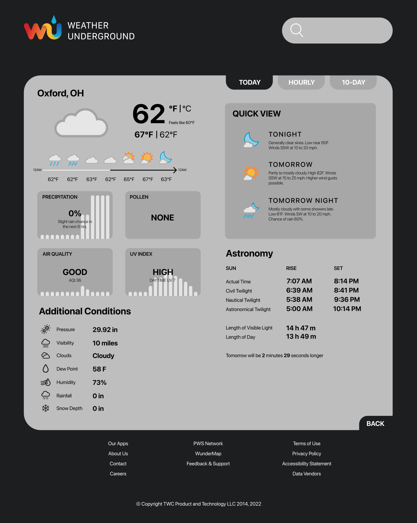 Most of the competitors’ websites are not clean and consistent which means including different kinds of weather data. Our redesigned website which is the Weather Underground is in dark mode style, when testers clicked on other pages of the website, it is not dark mode. Sudden transitions make the eyes especially uncomfortable. It also has a wealth of weather data. Not just limited to the weather. There are even details about astronomy. The alternative information sometimes could attract some people to click to check.